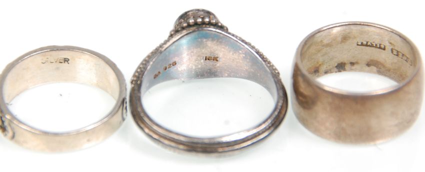 A group of fourteen silver ladies rings of varying sizes and designs to included three bands, marcasite band ring, one set with two rectangular cut white stones, engraved moon and stars ring etc. Most being 925 or silver. Gross weight 50.2g.