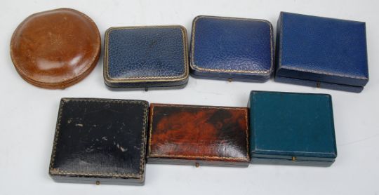 A good group of seven vintage cufflink & stud leather boxes with most having gilt tooled decoration with velvet and silk lined interiors. Some bearing makers marks to include Hessenberg, James Gazz Aberdeen etc.