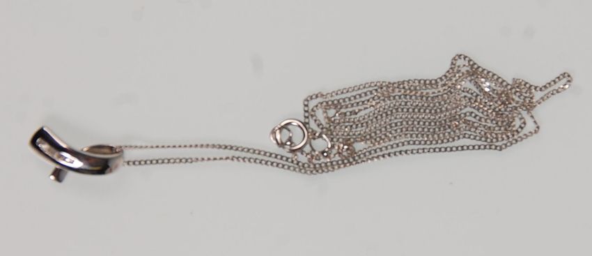 A 9ct white gold pendant necklace having a fine link chain with white gold pendant set with four round cut white stones. Weight 1.2g.