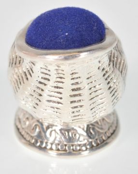 A stamped 925 silver pincushion in the form of a conch shell, having a blue velvet cushion to the back. Weight 25.8g.