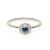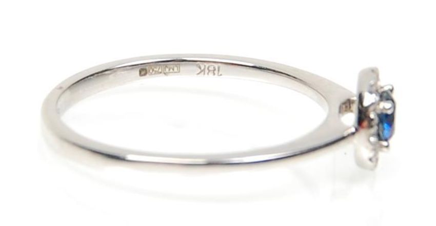 A stamped 18ct white gold ring set with a round cut sapphire and a halo of diamonds. Weight 1.8g. Size L.