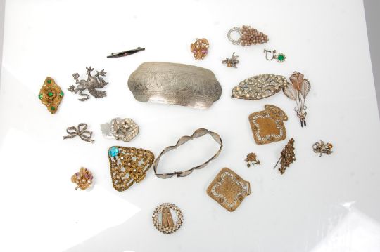 A collection of vintage 20th century fashion jewellery brooches and belt buckles to include a filigree floral brooch, a large silver white metal hair clip with engraved decoration, an art deco belt buckle set with white stones, a Griffin brooch, a pair of floral 1960's clip on earrings set with pearls, a vintage coin bracelet etc.