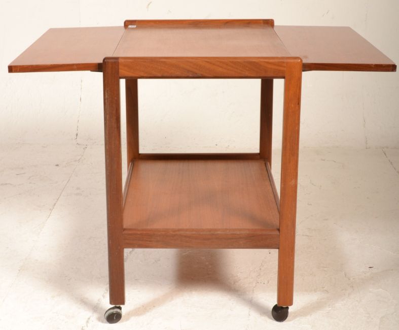 A good retro 20th Century teak wood tea trolley having two drop leafs with second tier below raised curved supports with castors. Together with a retro nest of tables raised on straight legs united by stretchers. Measures 65 cm high  x   87 cm wide  x  68 cm deep.
