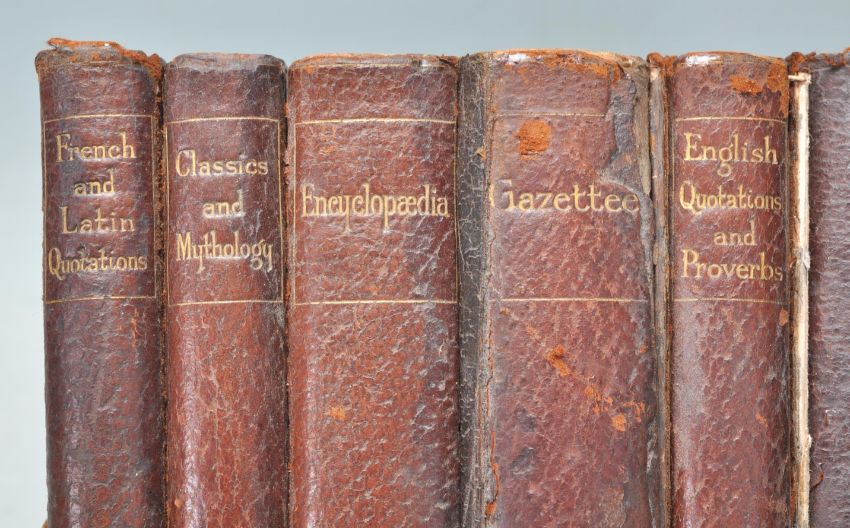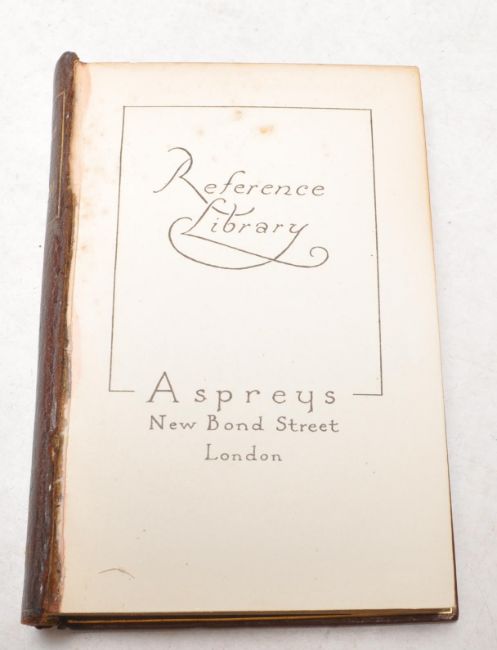 An early 20th Century oak Asprey's  of London small book shelf / book stand complete with a selection of leather bound antique books including a French and English Dictionary, French and Latin Dictionary Encyclopedia etc. Measures 19 cm high x 20 cm wide x 17 cm deep.