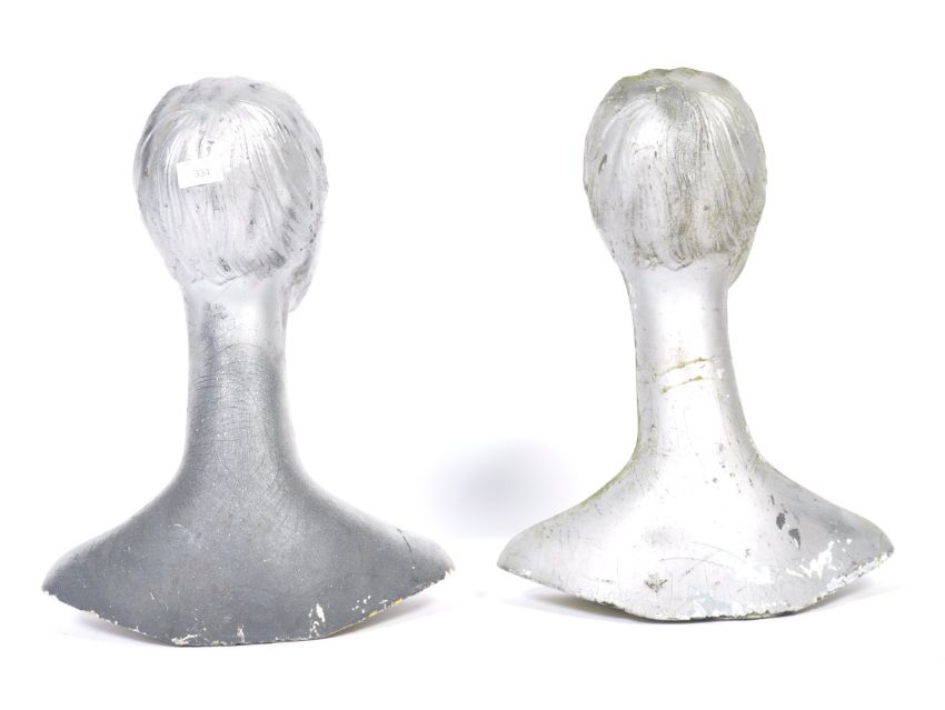A pair of mid 20th Century retro vintage fibreglass shop advertising point of sale mannequin busts in a stylised form of faceless women with sculpted hair finished in silver. Measures; 47cm tall.