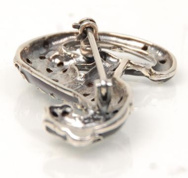 A stamped 925 silver brooch in the form of a jaguar having a black enamelled finish, set with marcasites. Weight 8.7g. Measures 4.5cm tall.