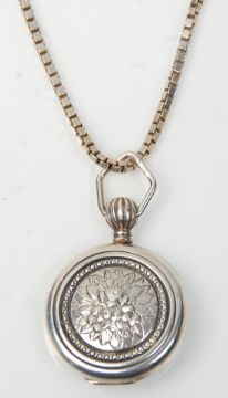 A stamped 925 silver locket of round form having repousse floral decoration on a stamped 925 silver box link chain. Weight 29.6g. Measures 17.5 inches.