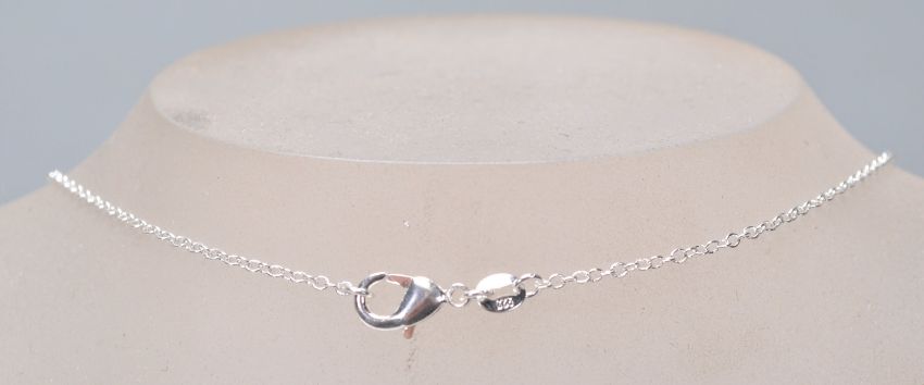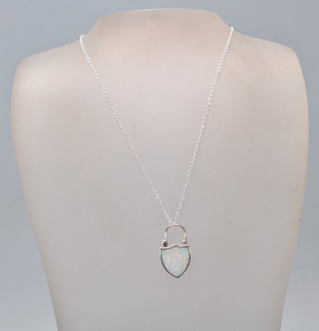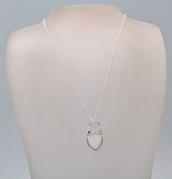 A stamped 925 silver pendant necklace having a shield design lock pendant set with an opal panel. Weight 6g. Chain measures 18 inches.