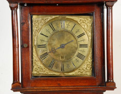 A 19th Century mahogany long case 30 hour movement grandfather clock having a square gilt face with a round dial with enamelled roman numerals to the chapter ring and raised floral decoration.