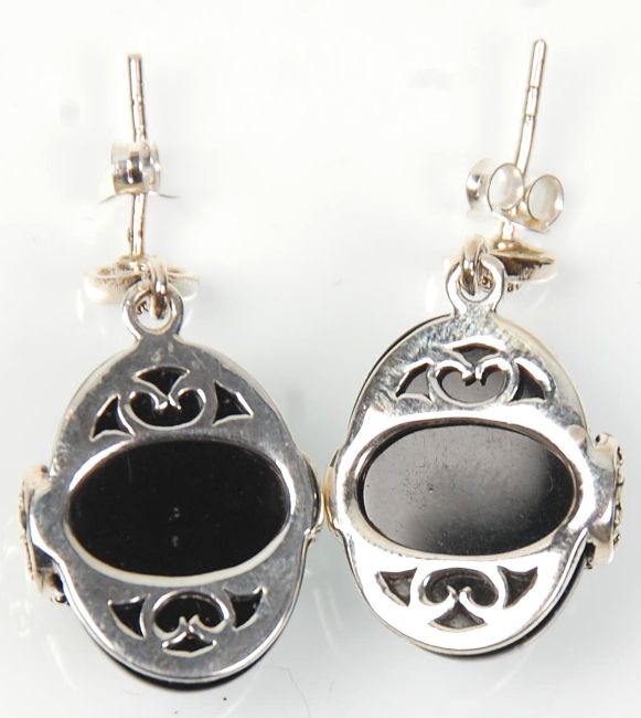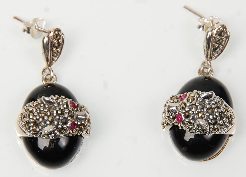 A pair of stamped 925 silver drop earrings in the form of leopards upon black onyx stones, set with marcasites. Weight 12.6g. Measures 3cm.