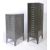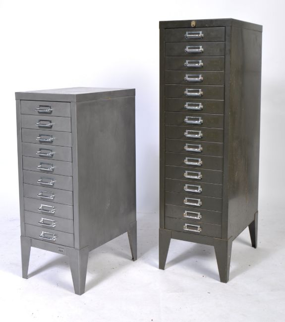 Two 20th Century retro vintage industrial multi drawer metal filing cabinets comprising of tall 14 drawer example in olive green and a smaller 10 drawer example in grey. Tubular pull handles to front with name holders. Measures: 99cm x 29cm x 42cm.