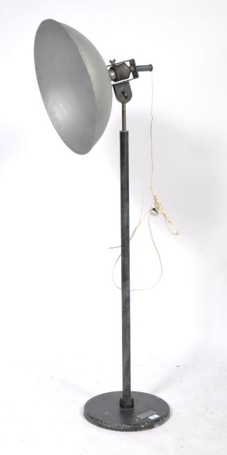 Famed - A mid 20th Century retro vintage industrial medical operating theatre lamp having a large brushed metal domed shade attached to a multi adjustable pivot raised on a telescopic upright on a round base. Applied plaque to base. Measures; 140cm x 45cm x 45cm.