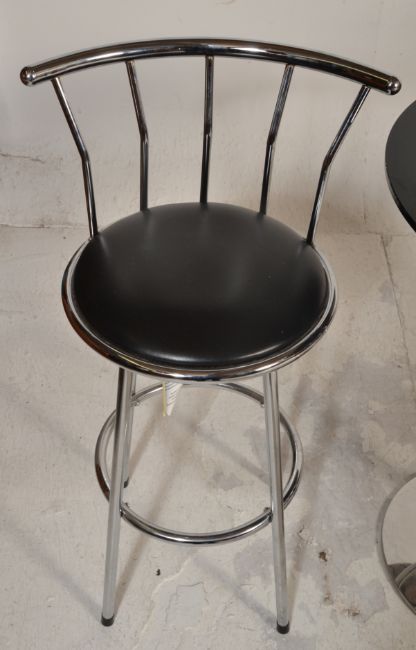A 20th Century glass topped bistro style table having a black glass top raised on a chromed pedestal base with foot rest. Together with a pair of black and chrome pump stools. Measures 90 cm  x  70 cm diameter.