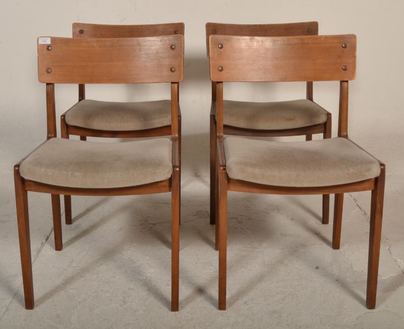 A good set of four vintage retro 20th Century teak framed dining chairs having single bentwood back rests with fabric covered seat pads and tapering legs. Measures 75cm tall by 46cm wide and 45cm deep.