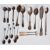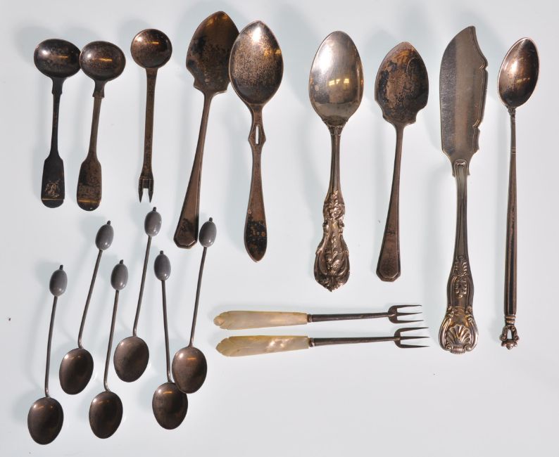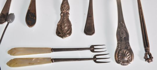 A mixed group of silver flatware dating from the 19th Century to include mostly spoons, set of six coffee bean spoons, jam spoon, two mother of pearl handled pickle forks, one having a church moulded handle, silver fish knife hallmarked for London, decorative floral moulded table spoon etc. Varying marks. Total weight 291g. Longest measures 18cm long.