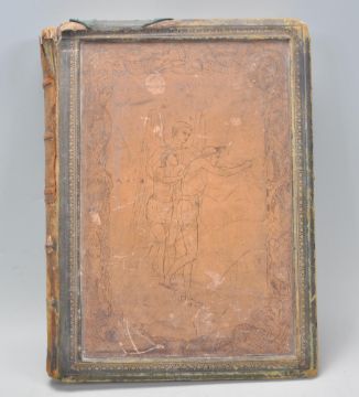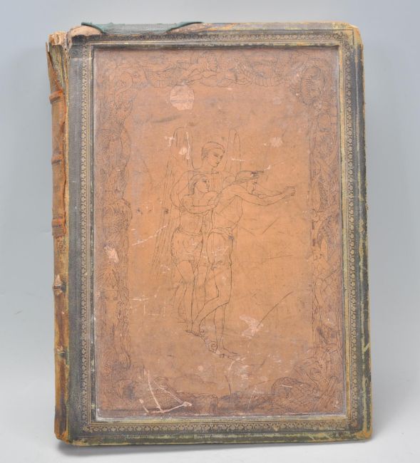 First Edition - A leather bound book entitled 'Ramblings In The Elucidation Of The Autograph Of Milton' by Samuel Leigh Sotheby. Printed by Thomas Richards London. Various plates throughout, set within a green leather binding with gilt tooled work with front and back having engraved wooden plates referring to Paradise. Measures 37cm long by 27cm wide.