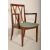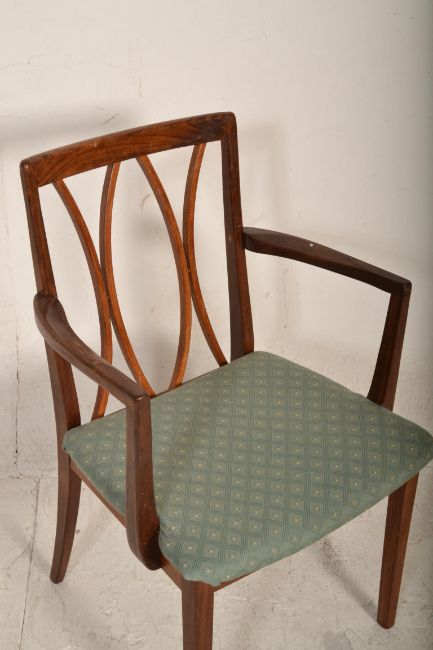 A 20th Century carver arm chair having a teak wood frame with pierced bowed wooden design back rest, shaped arm rests and square legs, complete with upholstered seat.