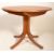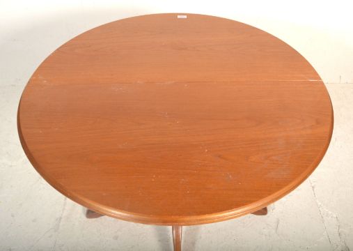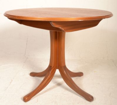 A vintage retro teak wood dining table having a round extending table top raised on four central bowed legs. Marked Sutcliffe. Measures 78cm tall by 100cm diameter.
