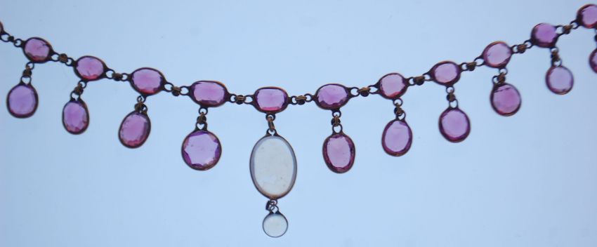 A late 19th Century gold necklace set with faceted garnet drops with a central moonstone drop. Gold unmarked but tests as 14ct. Weight 10.0g. Measures 15 inches.