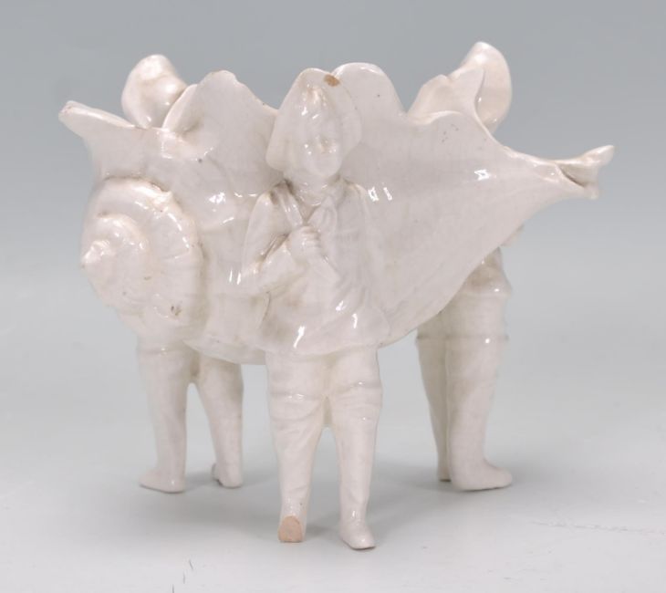 A 19th Century Continental pearlware ceramic table salt in the form of a conch shell supported by three flemish figures. Measures 10cm tall by 13cm wide.