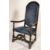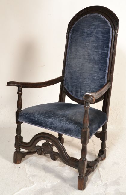 A 17th century oak armchair. Raised on block and turned legs with arched crinoline stretcher to centre. Above, a blue upholstered seat and back rest flanked by scrolled and shaped elbow rests, tall back rest with show wood oak frame. Measures 115 x 69 x 52cm.