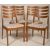 A set of 4 Danish teak wood dining chairs having tapering legs with pad feet and overstuffed pad seat. Above, a tall back rest with feathered horizontal rails. Measures 90 x 48 x 47cm.
