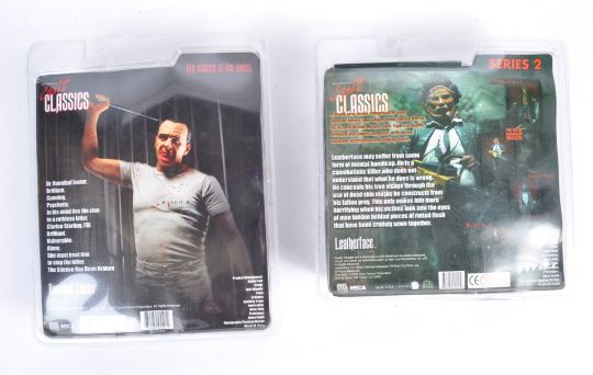 A collection of 4x Neca Reel Toys horror action figures to include Hannibal Lecter The Silence Of The Lambs, Leatherface The Texas Chainsaw Massacre, Freddy Krueger and another unidentified figurines. The first two appearing mint and unused within original packaging. Figures 8".