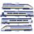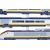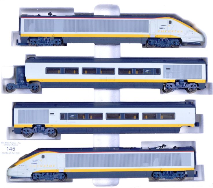 A Hornby made 00 gauge model railway trainset locomotive 4-car Eurostar set (possibly R665A). Comprising locomotive, dummy and x2 coaches. Supplied within the original polystyrene packing. Highly detailed set.