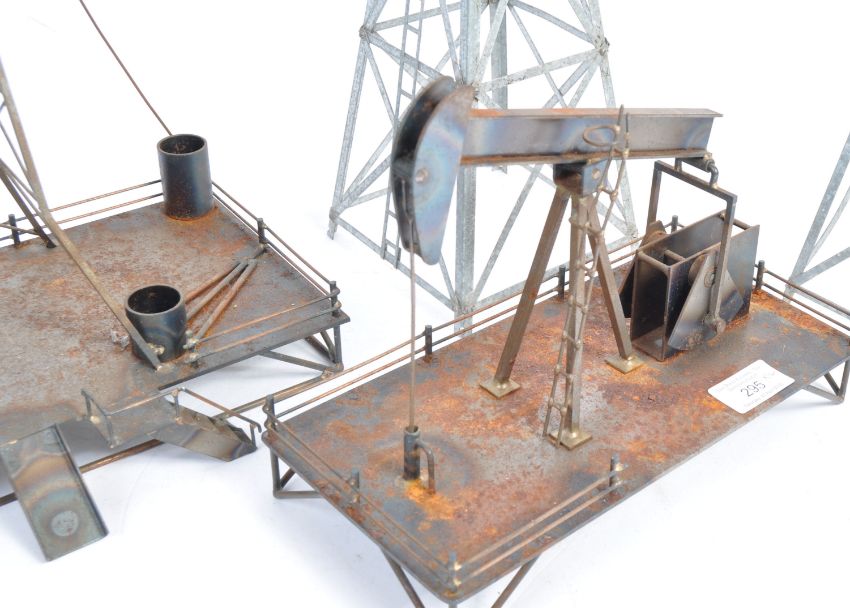 A collection of presumed 00 Gauge model railway sheet metal constructed scratchbuilt models of an oil well and an oil tower / rig along with two other models of oil towers. Highly detailed models with some moving parts. Measures: 40cm tall.