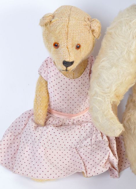 A charming collection of x5 antique / vintage teddy bears. Comprising; a vintage Chad Valley pink and polka-dot rabbit, a larger orange Fechter Mohair bear (German), a Tara Toys 'Made In The Republic Of Ireland' large bear (with label), an unnamed Steiff style teddy bear with knitted / repaired features, and a smaller antique golden mohair teddy bear in a later dress. Great collection. Tallest approx; 50cm.