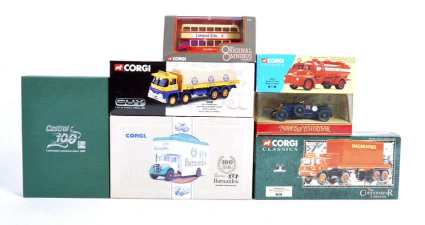 A collection of x4 Corgi made boxed diecast model sets from various series, to include; Corgi Classics 20201, Corgi Guy Invincible 29101, Corgi Connoisseur Collection, and Corgi Classics 97087. Along with an Original Omnibus model, Matchbox Models Of Yesteryear model and a Castrol 100 diecast model set. (7 total).