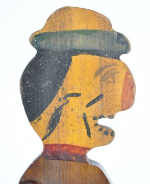 A charming antique late 19th / early 20th century Limberjack dancing toy / doll. Wooden and tinplate construction, the body of the clown stamped with a Patent No. Legs of litho-printed tin plate construction. Retains the original sit-on Limberjack board. Rare. Figure approx; 33cm tall.