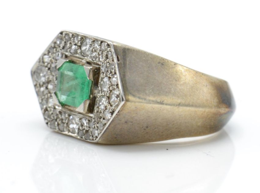A retro emerald and diamond ring. the ring set with a central emerald surrounded by pave set diamonds in rose and brilliant cuts. Unmarked.  Weight 9.6g. Size M.5 - O.