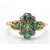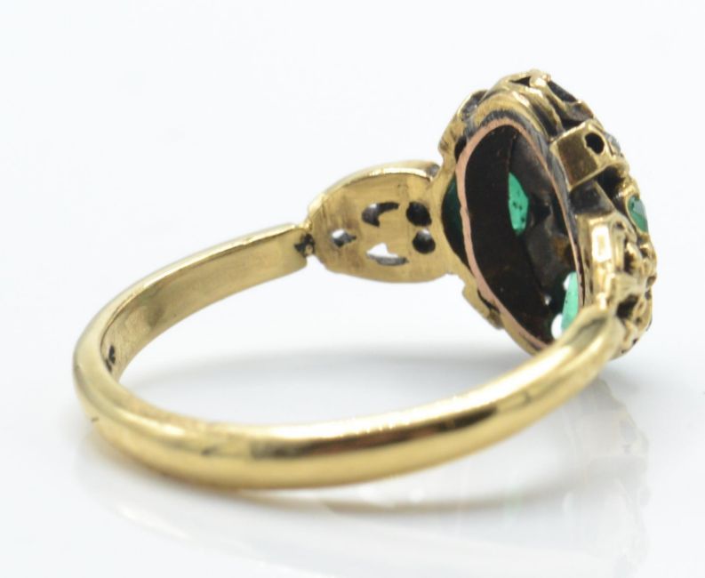An antique 18ct hallmarked emerald and diamond ring. The ring set with 5 emeralds and rose cut diamond embellished cross to scrolled shoulders and plain Weight 4.3g / Size P