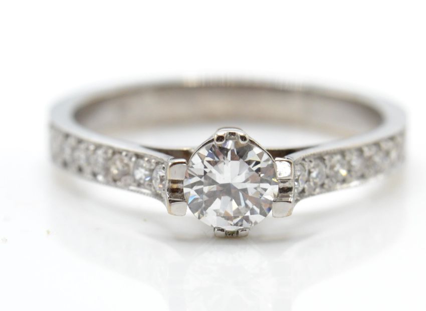 An 18ct white gold and diamond ring. The ring set with a round brilliant cut diamond estimated diamond weight 0.46cts having diamond set shoulders and plain shank. Total weight 2.8g/ Size M.5