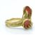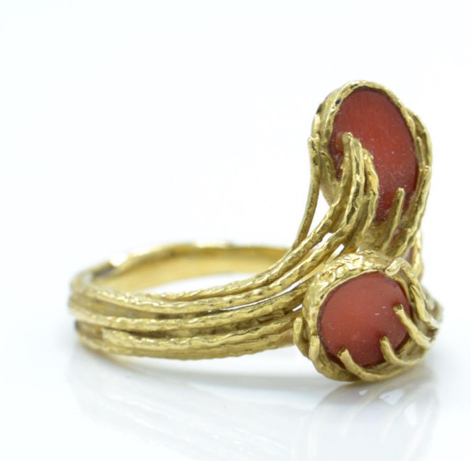 A hallmarked 18ct gold and coral ' comet ' ring. The ring of wire work form set coral oval plaques. Import marks for London, sponsors CJ Ltd. Total weight 8.3g / Size S