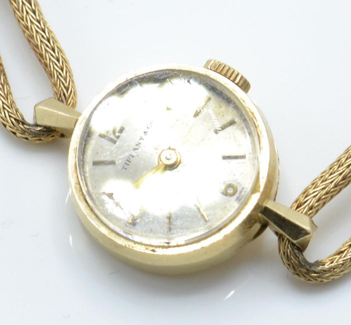 A 14ct gold early 20th century Tiffany & Co ladies cocktail watch having round case with baton numerals and dagger hands with the champagne dial marked Tiffany & Co. The wristwatch set to a 14k gold two string strap. Rear of case marked 14k Gold.  Total weight 12.27g