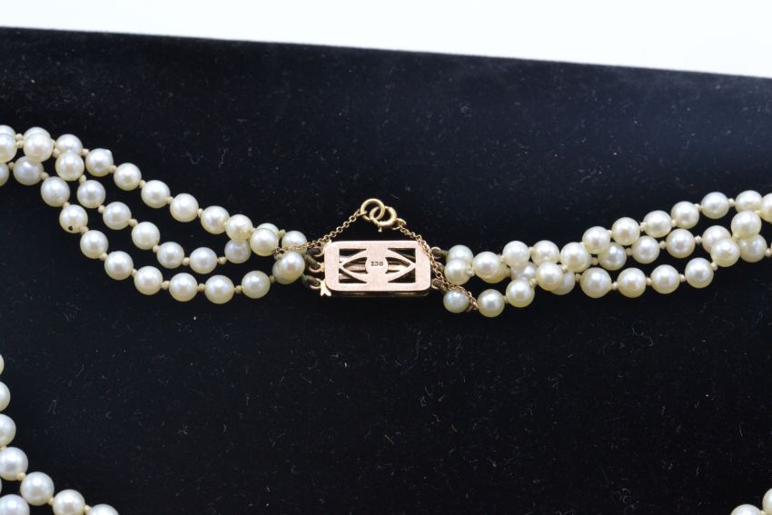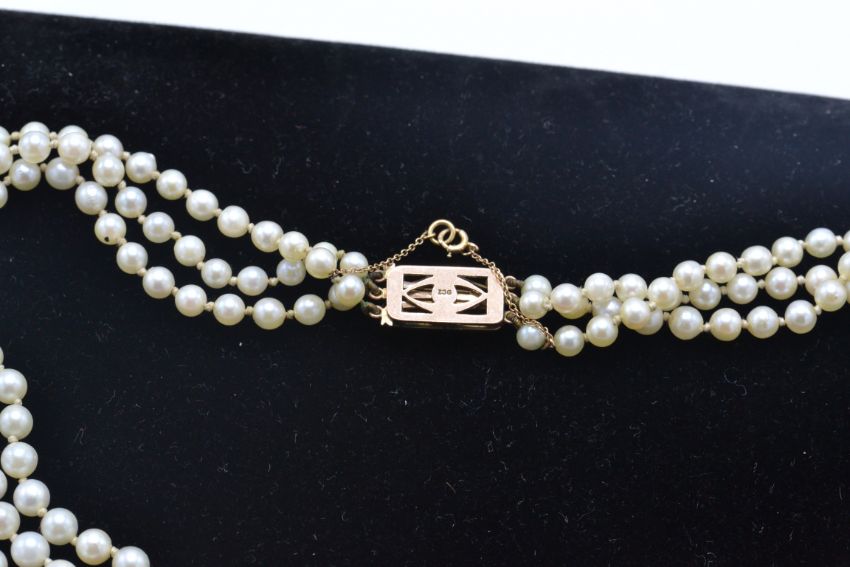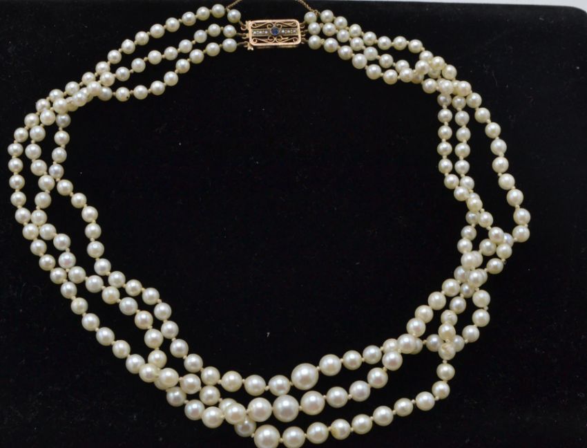 A 9ct yellow gold sapphire and pearl choker necklace. The necklace having 3 strings of graduating cultured pearls terminating in an Art Deco sapphire and pear pierced clasp with safety chain. Measure 15" / Weight 36.5g