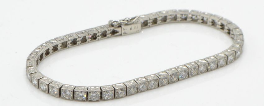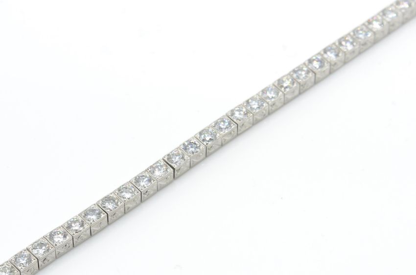 A platinum and diamond tennis bracelet. The bracelet having articulating scroll decorated box links set with 47 round brilliant cut diamonds completed by hidden snap and safety clasp. Estimated diamond weight 6.03ct. Marked PT 6.03ct. Total weight 22.9g. Measures approx 7 1/4 inches.