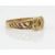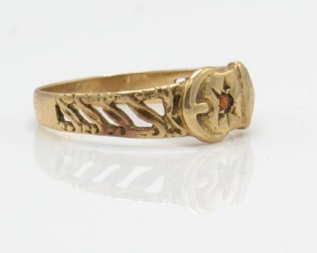 A hallmarked 9ct gold buckle ring. The ring having a buckle motif with orange garnet, pierced shoulders and plain shank. Hallmarked. Total weight 1.9g  / Size P