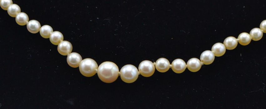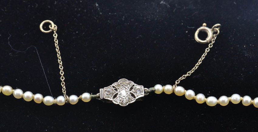 A cased pearl and diamond necklace. The single string of graduated pearls united by white metal and diamond clasp completed with safety chain being marked 9ct. The case in soft leather  material branded Hunt and Roskell Ltd / J Benson Ltd,  25 Old Bond Street. Pearls measure approx 2.3mm to 6.3mm. Necklace measures approx 17 inches. Weight 7.8g.