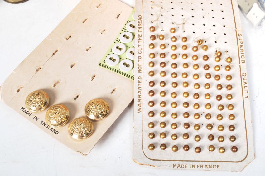 A collection of retro vintage mid 20th century buttons to include a group of gold coloured sphere shaped shank buttons, a group of gold plastic shank buttons in the form of coins, glass shank buttons having a central diamante crystal with gold rims, unusual shirt buttons having the effect of wood and many more unique styles. Taken from a large private collection. Measures approximately 0.5cm to 3cm in diameter.