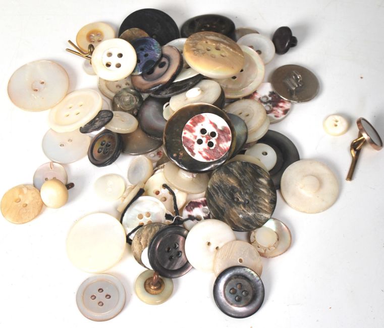 A collection of retro vintage mid 20th century decorative buttons in various styles to include shank buttons and shirt buttons and being made from plastic, mother of pearl, shell and metal. Taken from a large private collection. Measures approximately 0.5cm to 3cm in diameter.