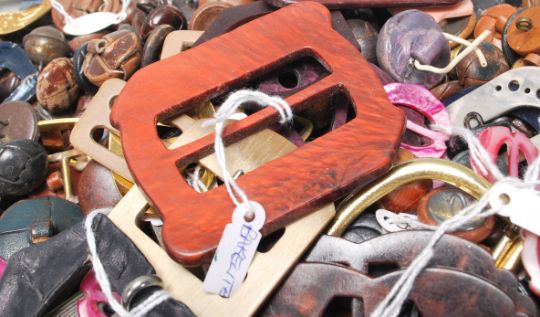 A large collection of unusual retro vintage mid 20th century buttons to include plastic buttons in the form of belt buckles in various colours, stitched woven leather shank buttons and gold coloured metal buttons. Taken from a large private collection. Measures approximately 1cm to 6cm.