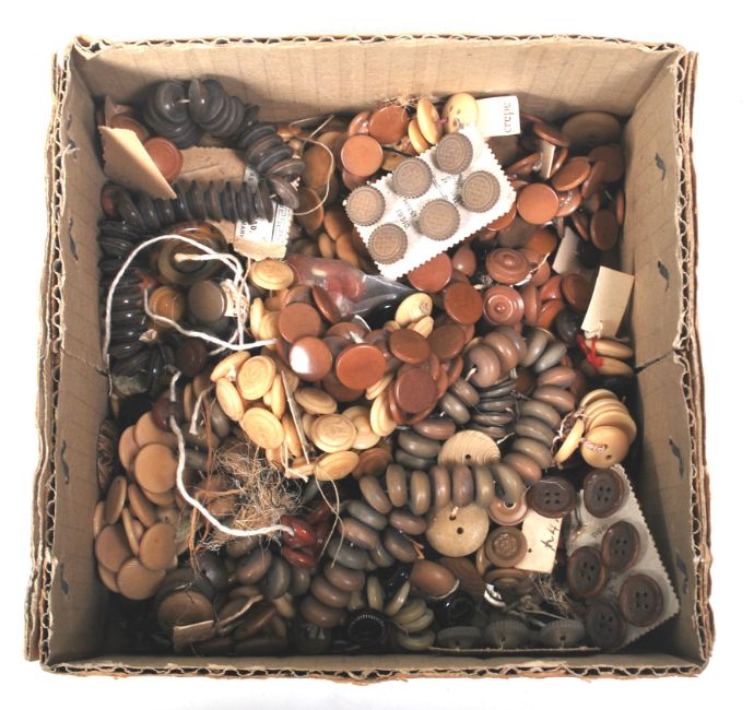A collection of retro vintage mid 20th century buttons to include a group of plastic heart shaped shank button in white and blue, black two hole shirt buttons having both gold and silver dash rims, green and purple fabric shank buttons, a box of decorative brown plastic buttons in various different styles and a a box of gold plastic shank buttons having a central faux pearl and a rope twist border. Taken from a large private collection. Measures 0.5cm to 5cm.