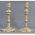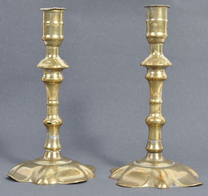 A rare pair of 18th Century English antique Georgian brass candlesticks raised on shaped petal bases with knopped column and small single sconces. Measures: 20cm.