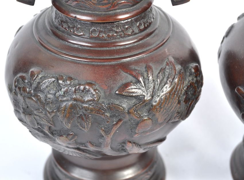 A pair of 19th Century Japanese Meiji period bronze vases having relief decoration depicting birds and trees with twin Fu dog handles to sides. The bronze vases finished in a red lacquer. Measures: 25cm tall.