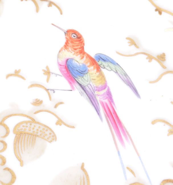 A pair of mid 19th English antique cabinet plates depicting a male and female brace of birds among gilded oak leaves with acorns. The plates of scalloped shape with hand painted decoration. Measures: 24cm wide.