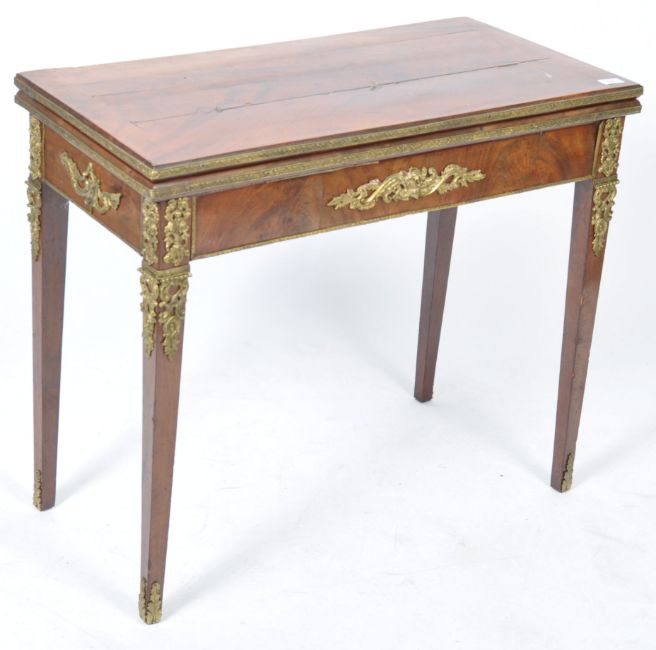 A 19th century flame mahogany and gilt ormulu mounted games / card table. The fold over top with inset oval green baize having a gilt metal banded front edge and returns. All above gilt brass ormulu embellished frieze and tapered legs with further gilt embellished detailing. H73 x W86 x D42cm