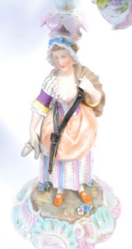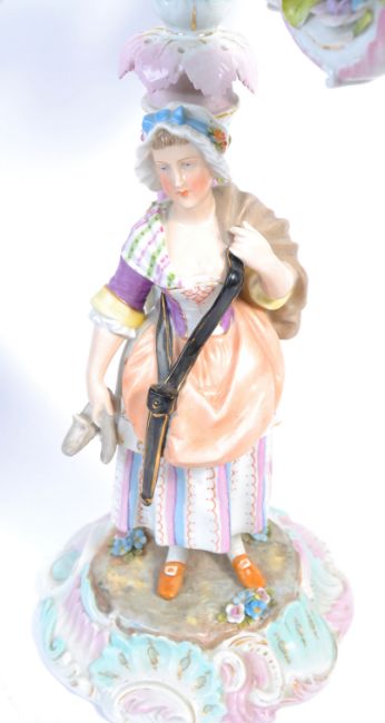 A pair of 19th century continental Meissen polychrome porcelain candelabra with detachable sconce raised on a column with figures on a shaped square base bedecked with encrusted flowers all over. Measures 55cm tall.